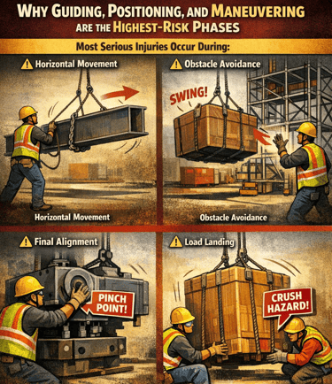 During these phases, suspended loads are most unstable and workers are most likely to approach the load to influence movement. This combination creates peak exposure to pinch, crush, and impact hazards.